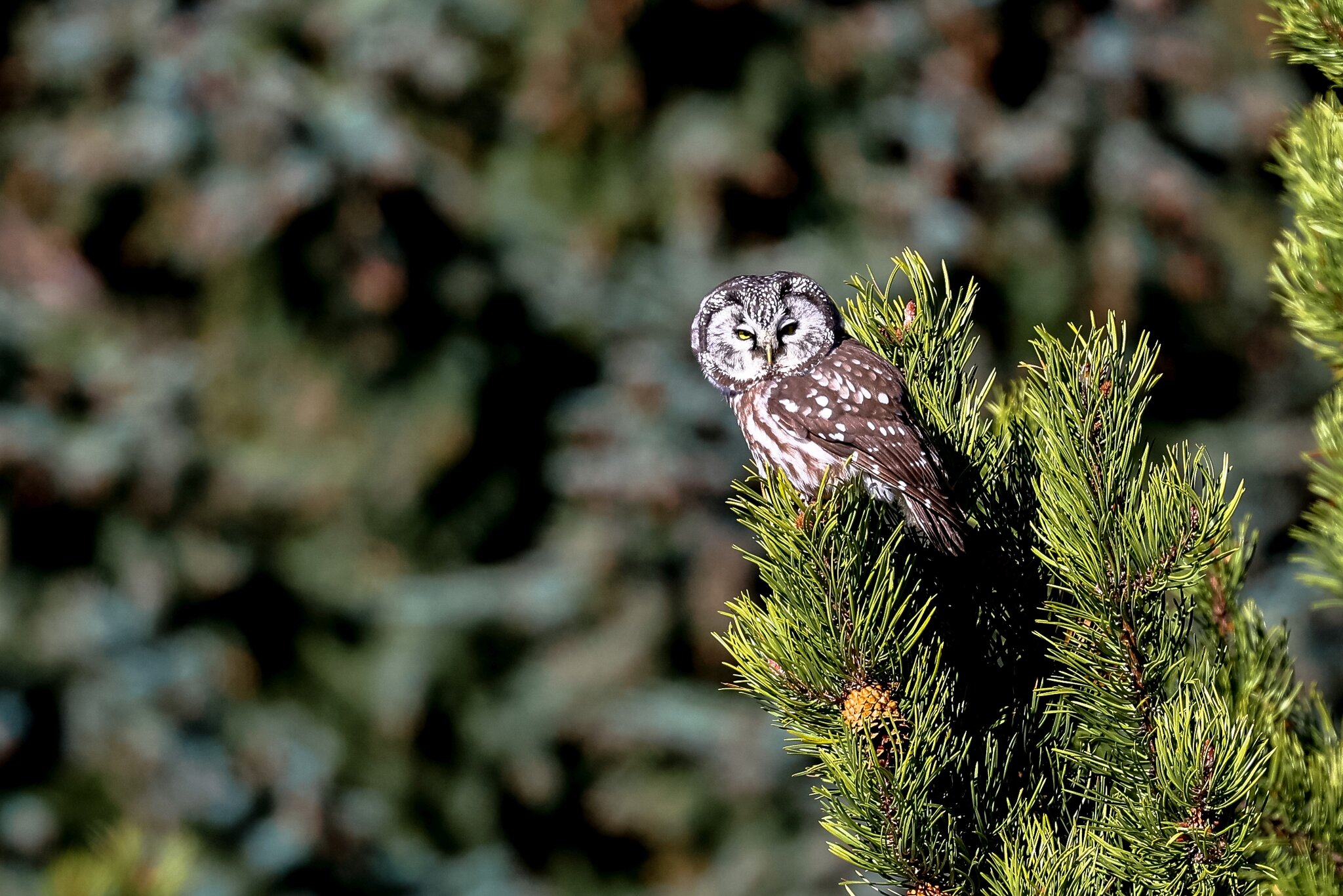 Nice shots and a great story. And a good reminder to always get a shot/look first, then work on getting close. had to double-check, but I’m pretty sure it’s a Boreal Owl. Northern Saw-whet has a dark bill and a more diffuse border around the face. A very nice find.Not the best but a little story behind it - On holiday in Canada, driving along and out the corner of my eye spot something sat on a fir branch 'omg - it's a tiny owl'. . . . . no other cars about so stop, reverse back and pull off the road, jump out open boot (trunk for our American friends) open camera bag - put lens on - hoping it's still there - yes! take a shot. . . . few steps closer another. . . . closer still and. . . . . gone! Moral of the story - keep the camera set up on the back seat lol.