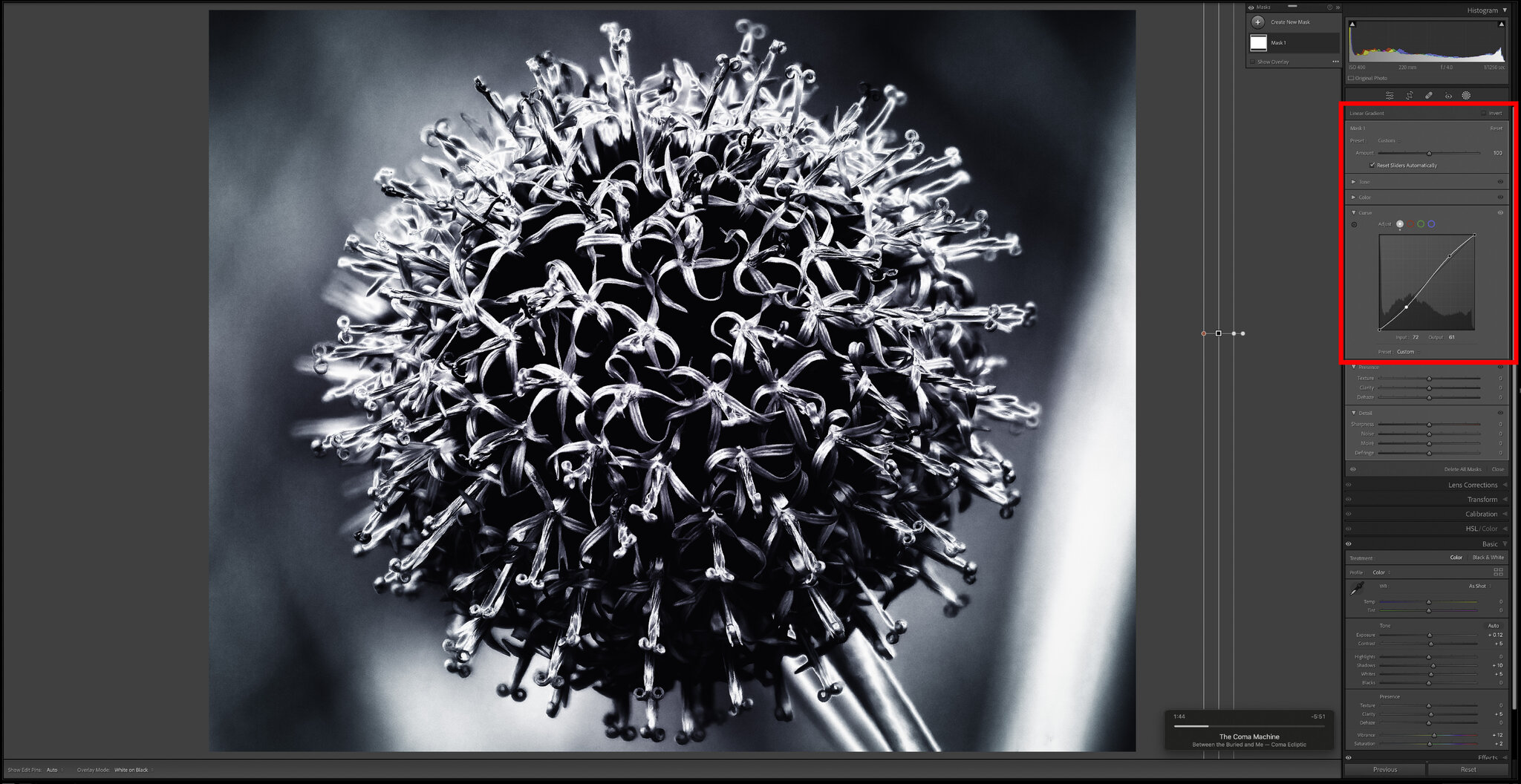 3. Bonus tip - In the below example I've used this method to apply a Curve adjustment (now available with the latest update) to the entire image and because it's a 'mask' I can also adjust the 'Amount' - something which would not be available using the normal Tone Curve tool in Lr C. I find this gives me fine control over the Curve adjustment without any frustrating fiddling about with points.