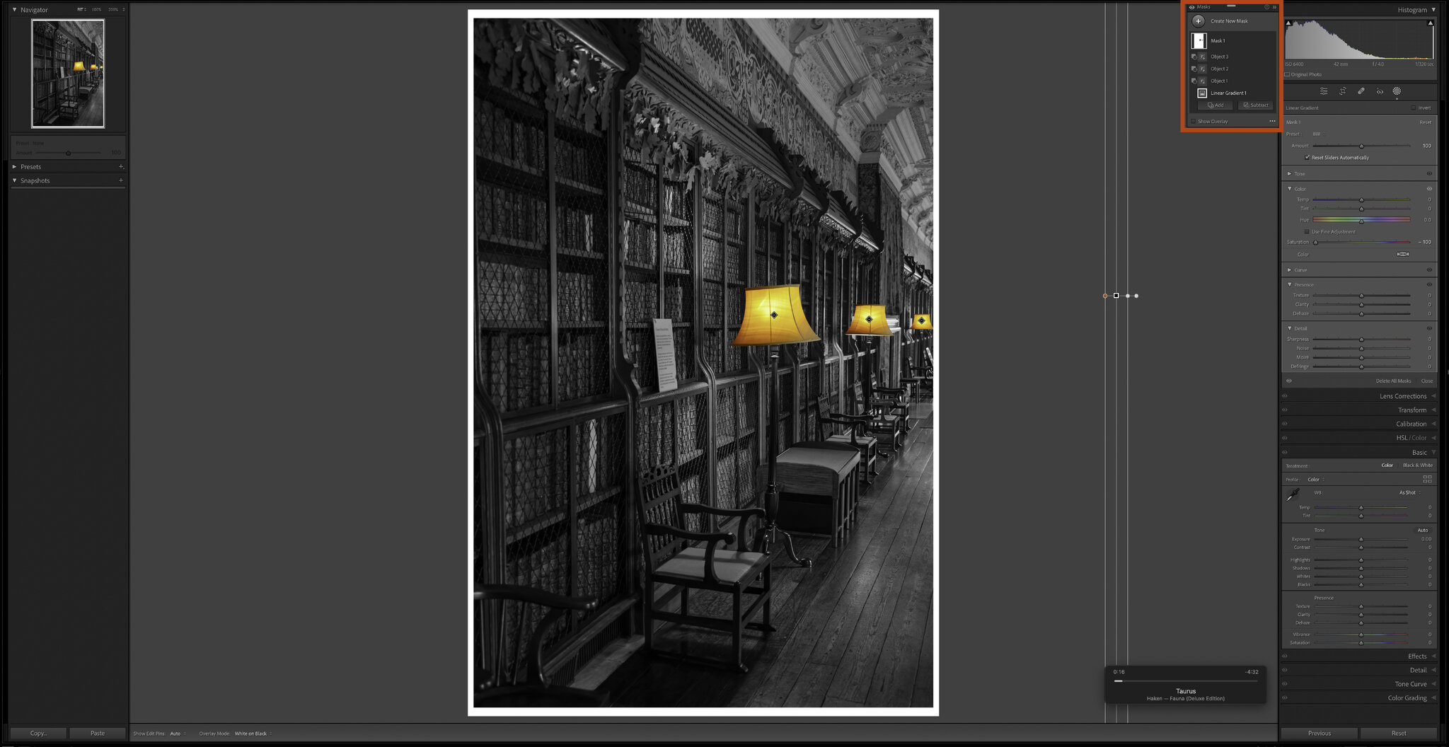 2. Draw a Linear Gradient off an image to apply a mask evenly across it, then make 'global adjustments' and selectively modify them (Add/ Subtract/ Intersect). In the below example I set Saturation to -100 to produce a B&W style image, then 'Subtracted' from the mask using Objects to selectively add colour back. You can get quite creative using different permutations of adjustments/ modifications. (Other global masking options are available, but I find the Linear Gradient is easy).