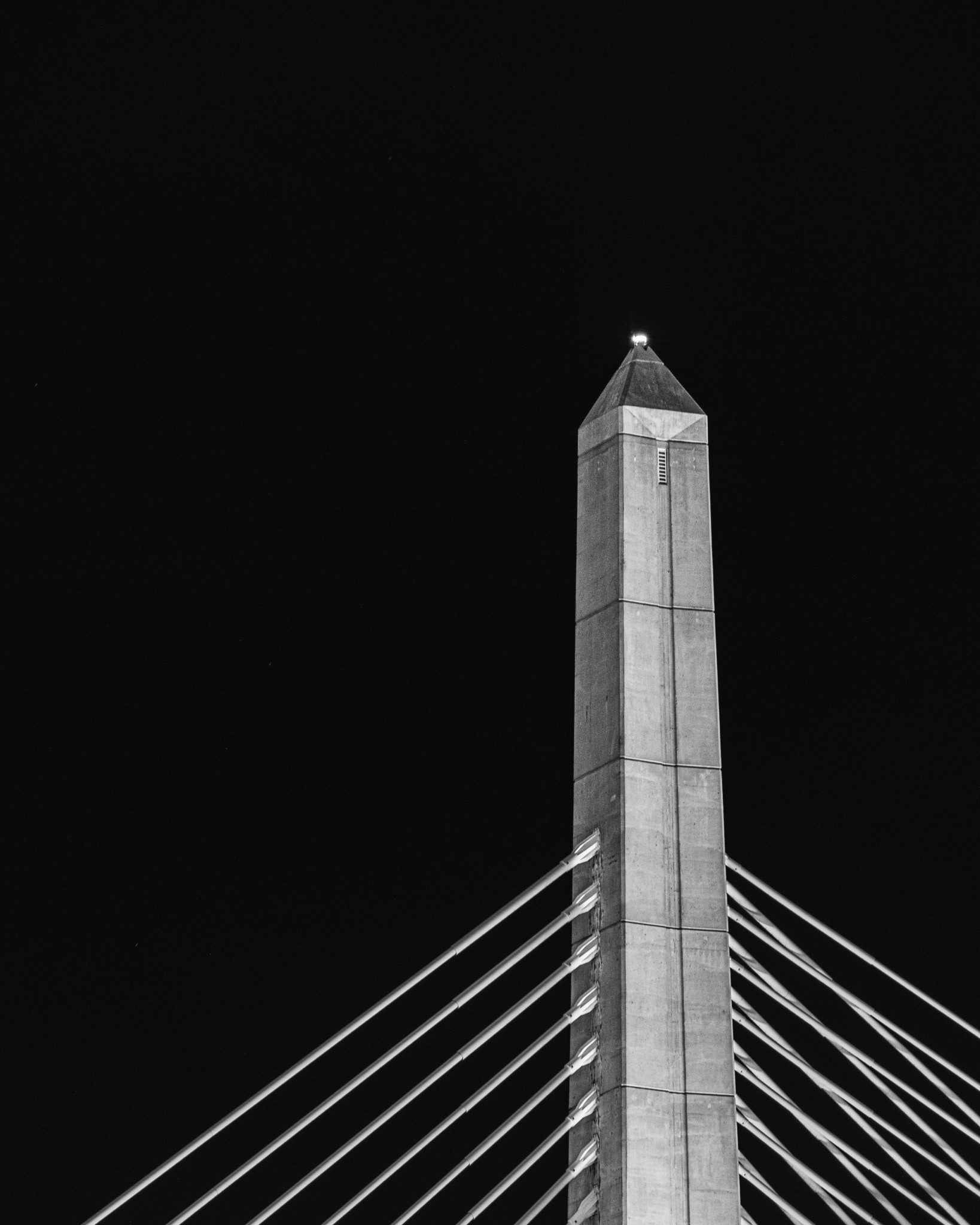 A bridge tower of the Leonard P. Zakim Bunker Hill Memorial Bridge at night. I liked the lines of the lit bridge tower against the dark sky. Typically referred to as the Zakim Bridge, the towers are shaped to represent the nearly Bunker Hill Monument, which commemorates the Battle of Bunker Hill, fought during the American Revolutionary War.