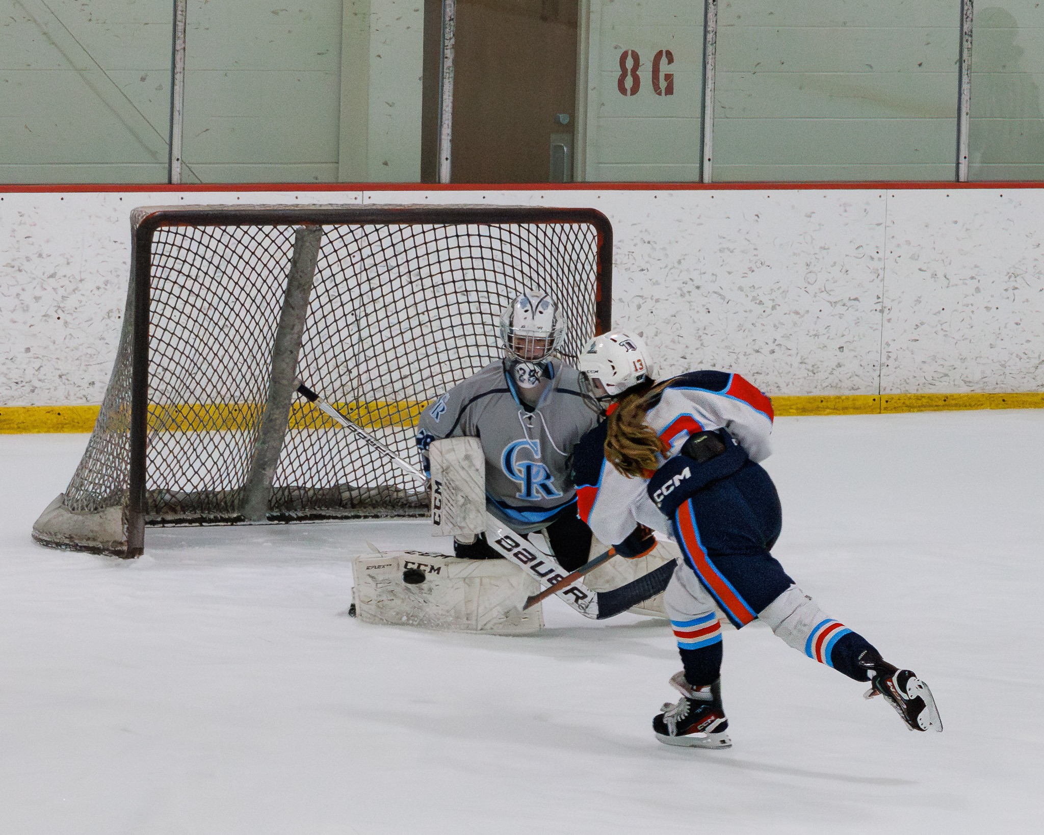 A photo of my niece taking a penalty shot at a hockey tournament. Although it looks like she might have the goalie beat, the puck went above the net.