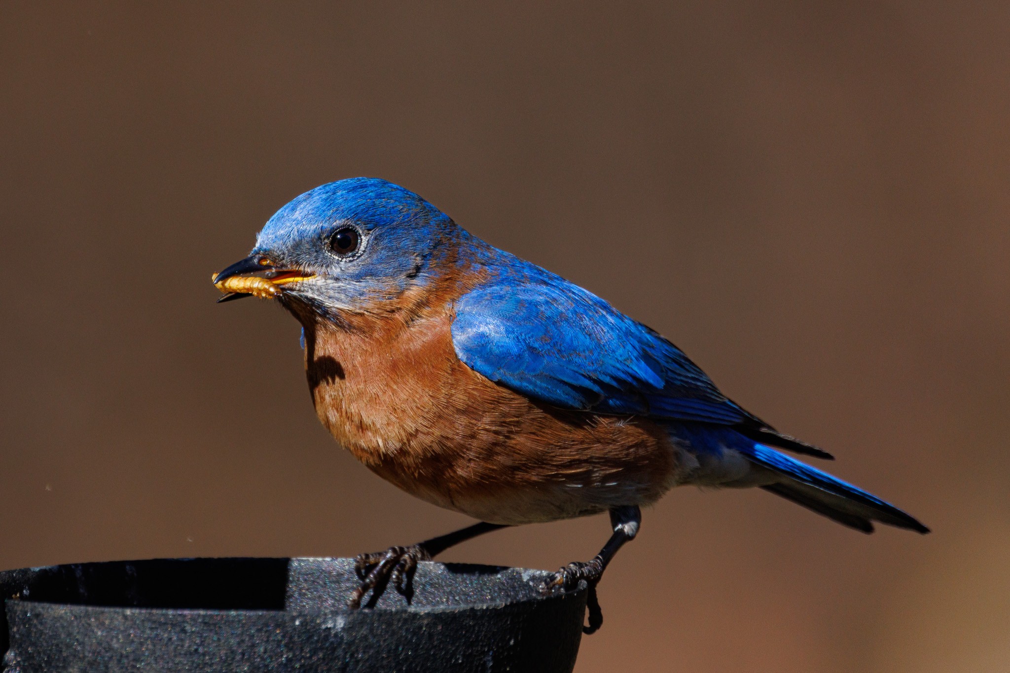 An eastern bluebird savoring a tasty mealworm snack at our feeder.