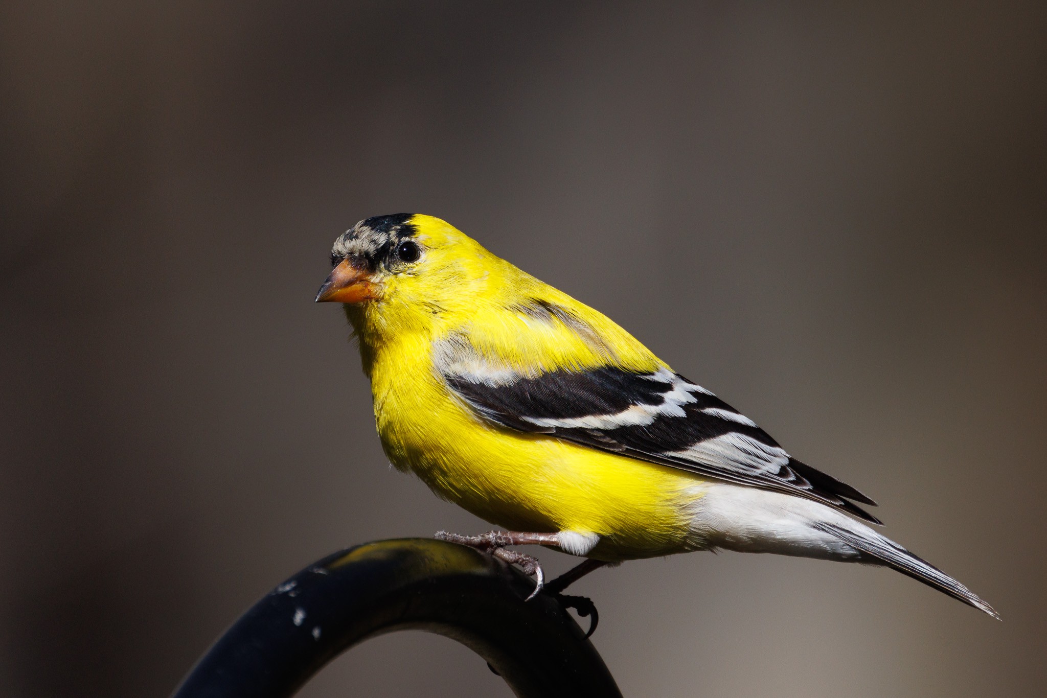 Finally, a work in progress: this male American goldfinch is changing from his relatively drab winter plumage to the bold black, white, and yellow plumage of mating season. This male seems to be more advanced in plumage than other males, which might give him a breeding advantage soon.