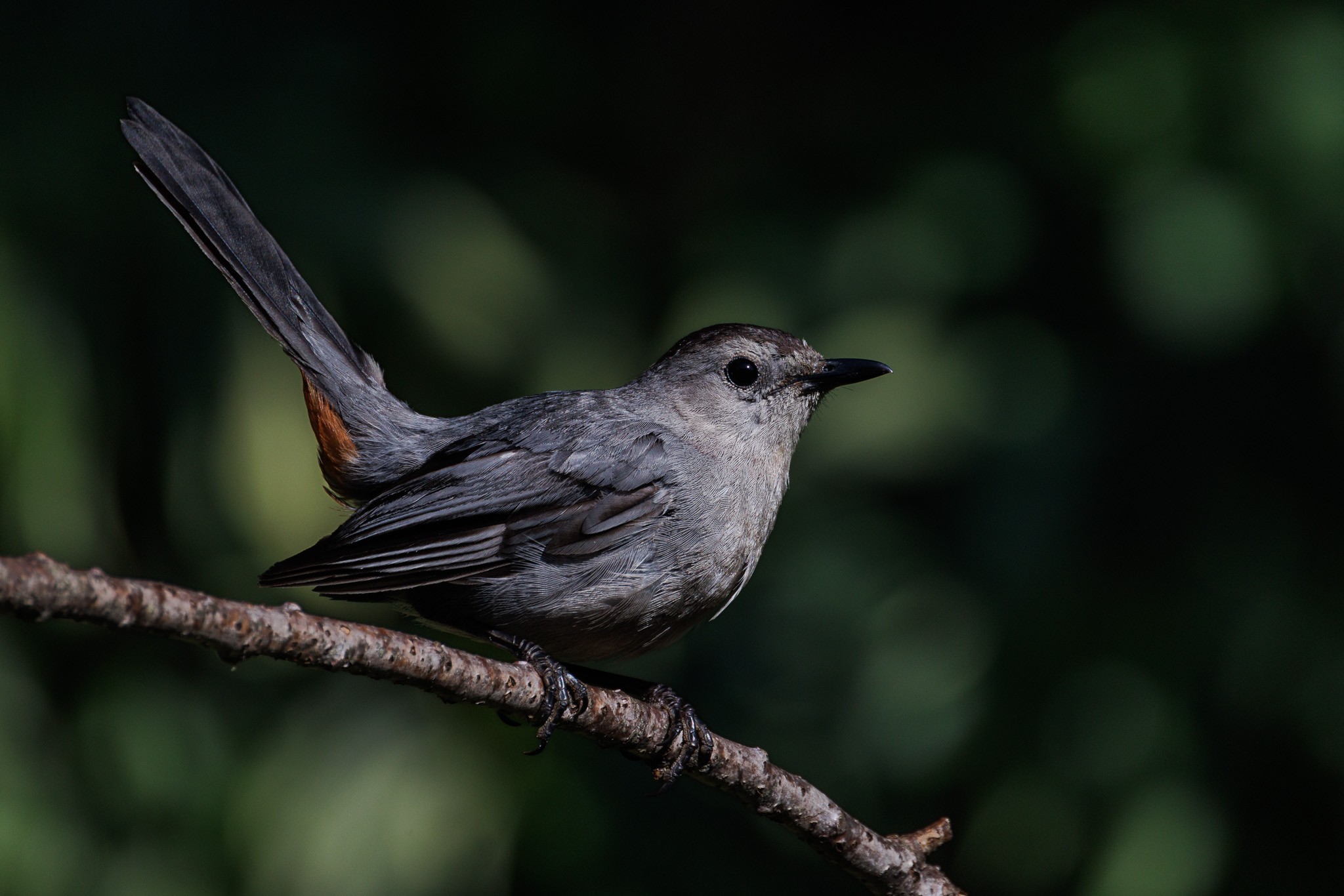 A grey catbird: the only color this bird has is on its rump, so to capture the color one usually needs to take an unflattering rear end shot. In this case the bird twisted and flicked its tail enough to be captured from a more flattering angle.