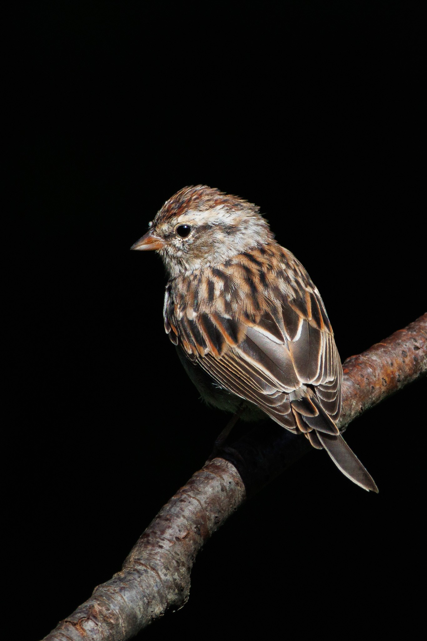 A chipping sparrow in early morning. This bird is missing some tail feathers due to molting