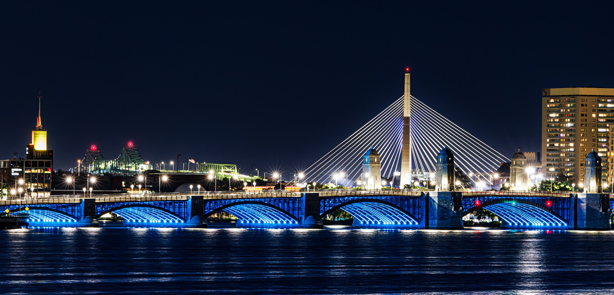 My wife and I had another nice summer evening walk around the Charles River area. I took this compressed photo of three very different-styled bridges