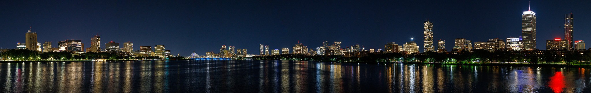Don't know how well this will come out for viewing because it is a long, thin panorama, but this is an ~180 degree panorama from the Harvard Bridge showing both sides of the Charles River, with the Cambridge skyline on the left and Boston on the right.