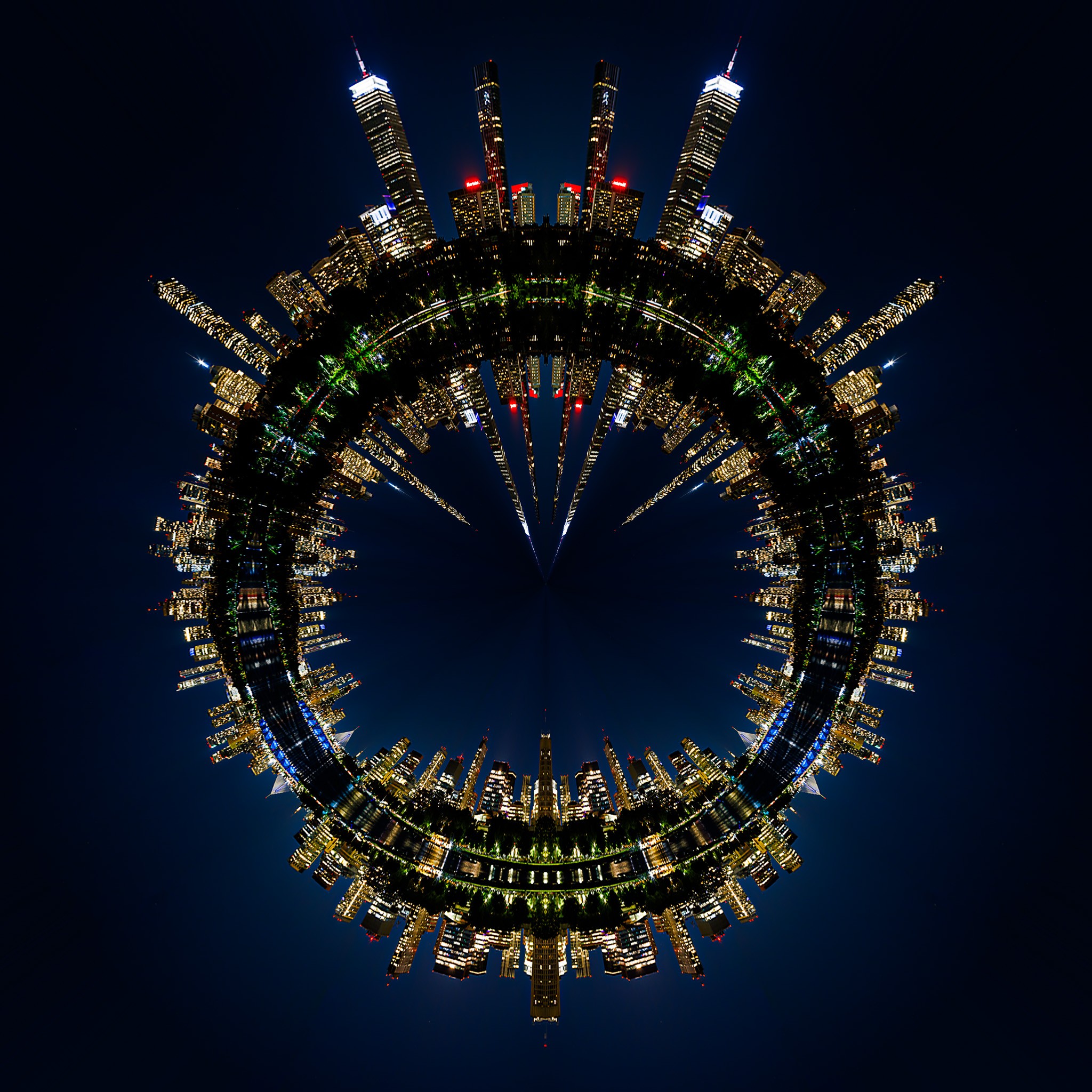 I decided to play with the panorama and created a double-mirrored image by creating a vertical copy of the panorama as a pseudo-reflection, then mirrored the panorama horizontally on the Cambridge side, then ran the image through the PS polar coordinate filter to create a "tiny planet" effect.