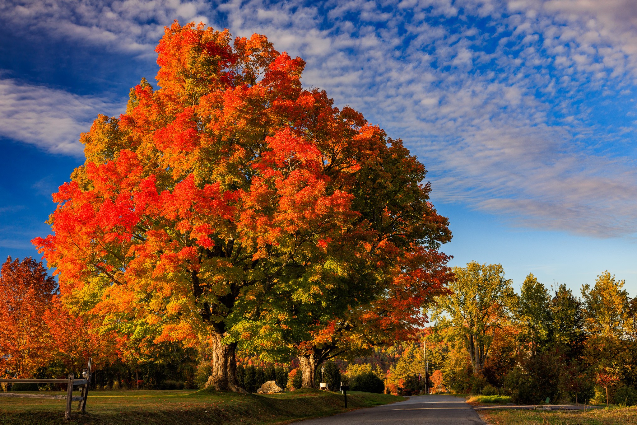 A beautiful turning tree lit by sunset light on the appropriately named Sunset Hill Road in Sugar Hill, New Hampshire