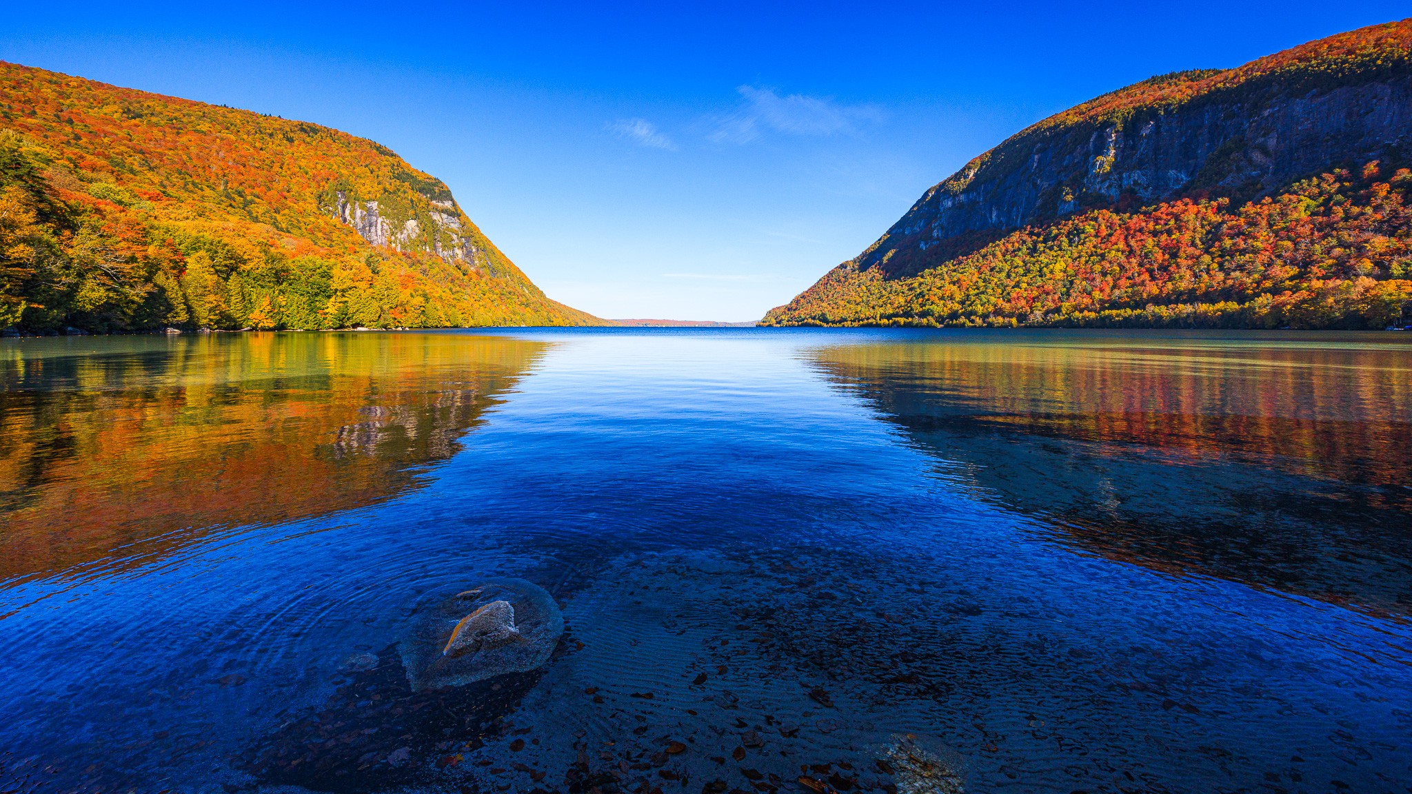 Lake Willoughby in Vermont is a glacial lake that is bordered by Mount Pisgah on the east and Mount Hor on the west, providing wonderful color that is lit nicely for the entire day.