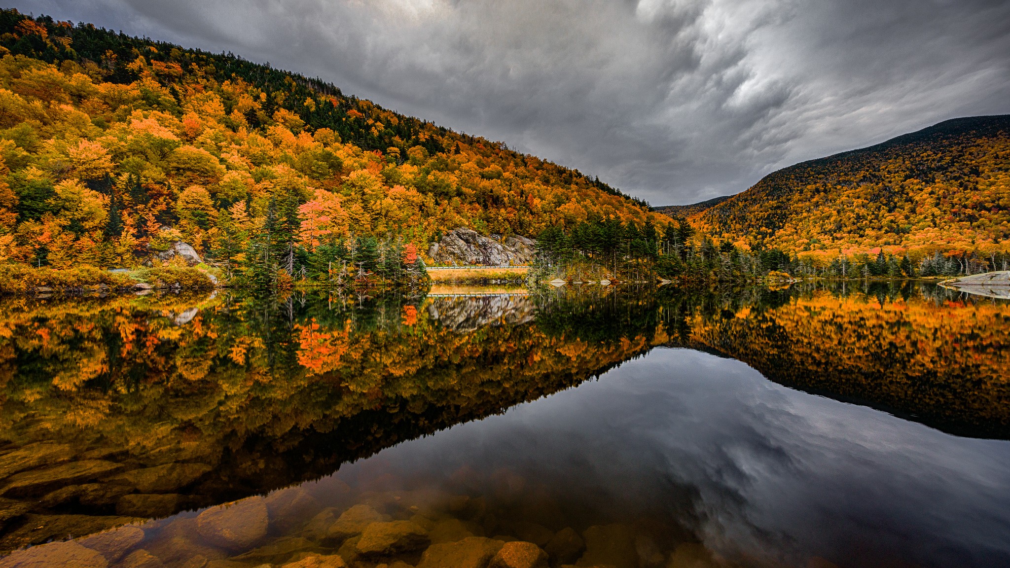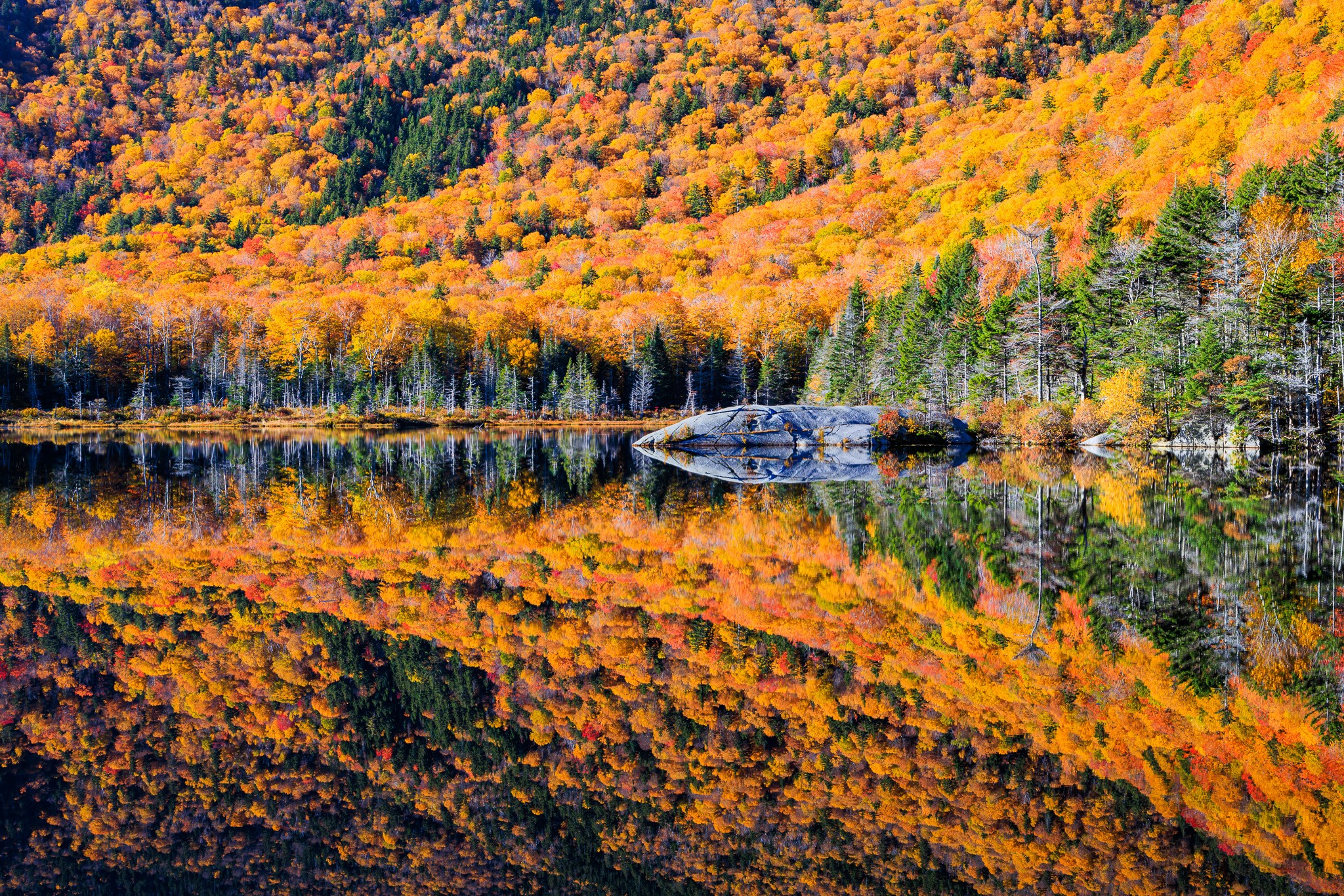 Beaver Lake in Woodstock, New Hampshire provides wonderful reflections on windless days. This photo is an HDR composite since we had a lot of cloud that morning, but the colors and reflections were great.