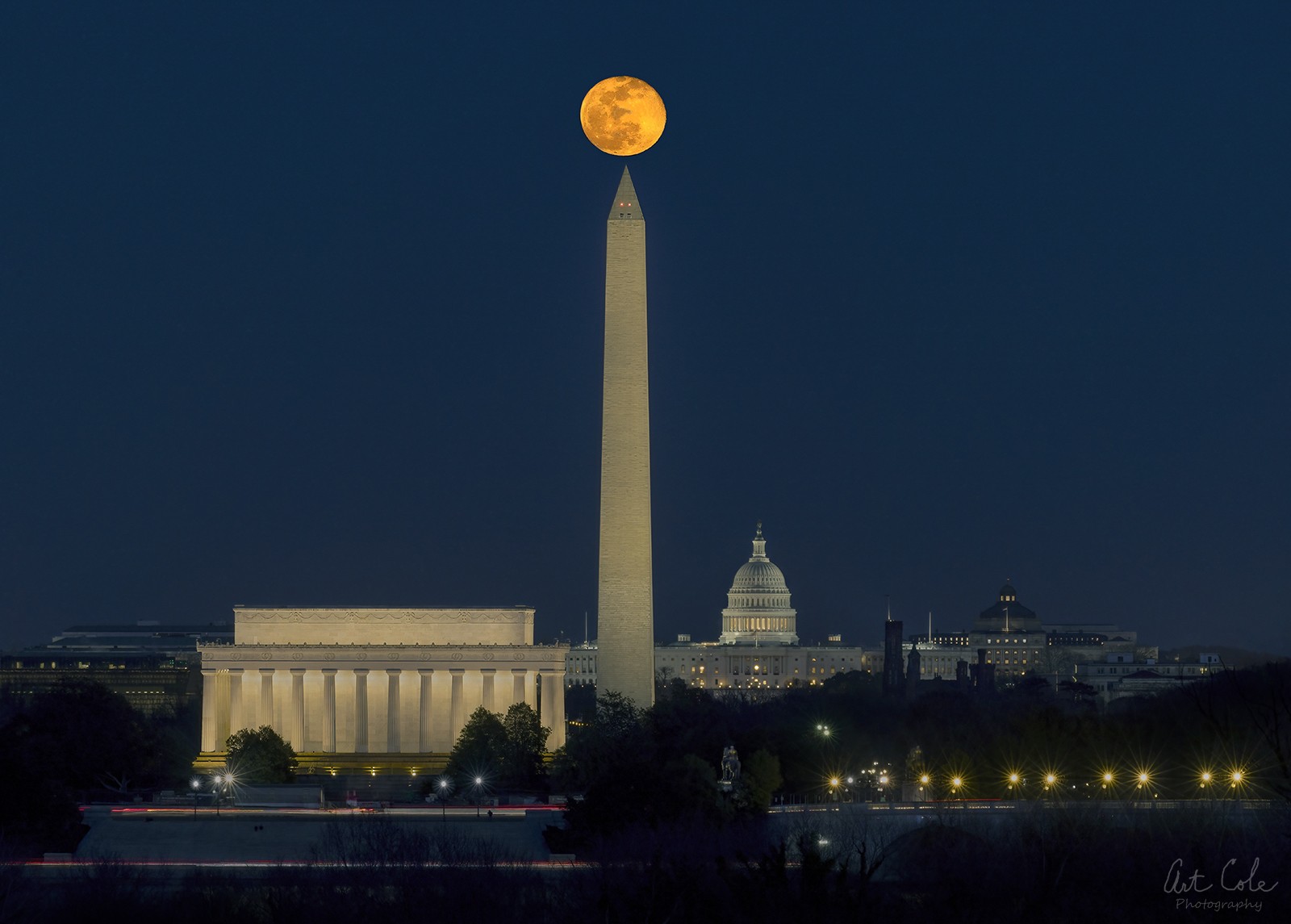 Sunday February 25, 2024 night skies were clear making capturing the moonrise over the DC Monuments possible. Here are two blended image from a Manassas Warrenton Camera Club Meetup I organized taken from the Carilion Bell Tower area next to the Iwo Jima Memorial in Arlington Virginia. The second image was taken as the moon was just over the tip of the Washington Monument and because the moon rose around 7:10 the skies were quite dark. The first blended composite image shows 3 stages of the moon rise on this night. These images were created by combining layers of the moon captured with a shorter exposure and faster shutter speed with a longer exposure and a smaller F stop to give lights a starburst effect, create light trails of cars and lighter monuments. I also decided to clone out some work fences and a trailer in front of the Lincoln Memorial.