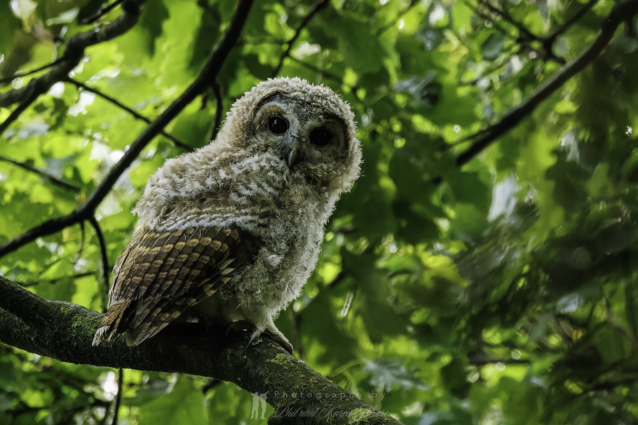 We've been hearing young tawny owls on our early morning strolls in our local woods (Hartshill Country Park, Warwickshire, England) this week, so we took the big lenses out yesterday morning. Karen spotted them in the tree canopy (very) high above us - and, of course, they had spotted us... :)