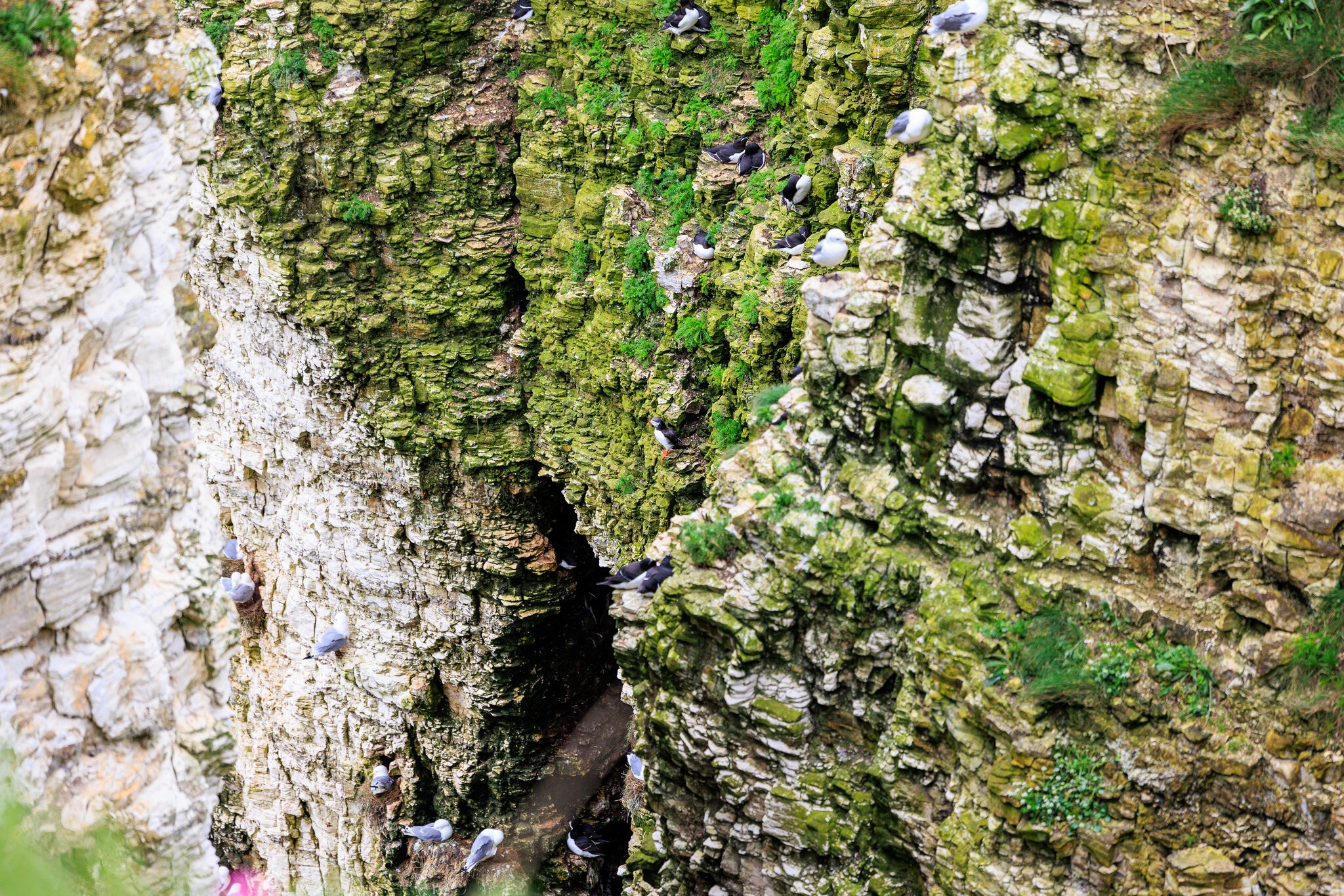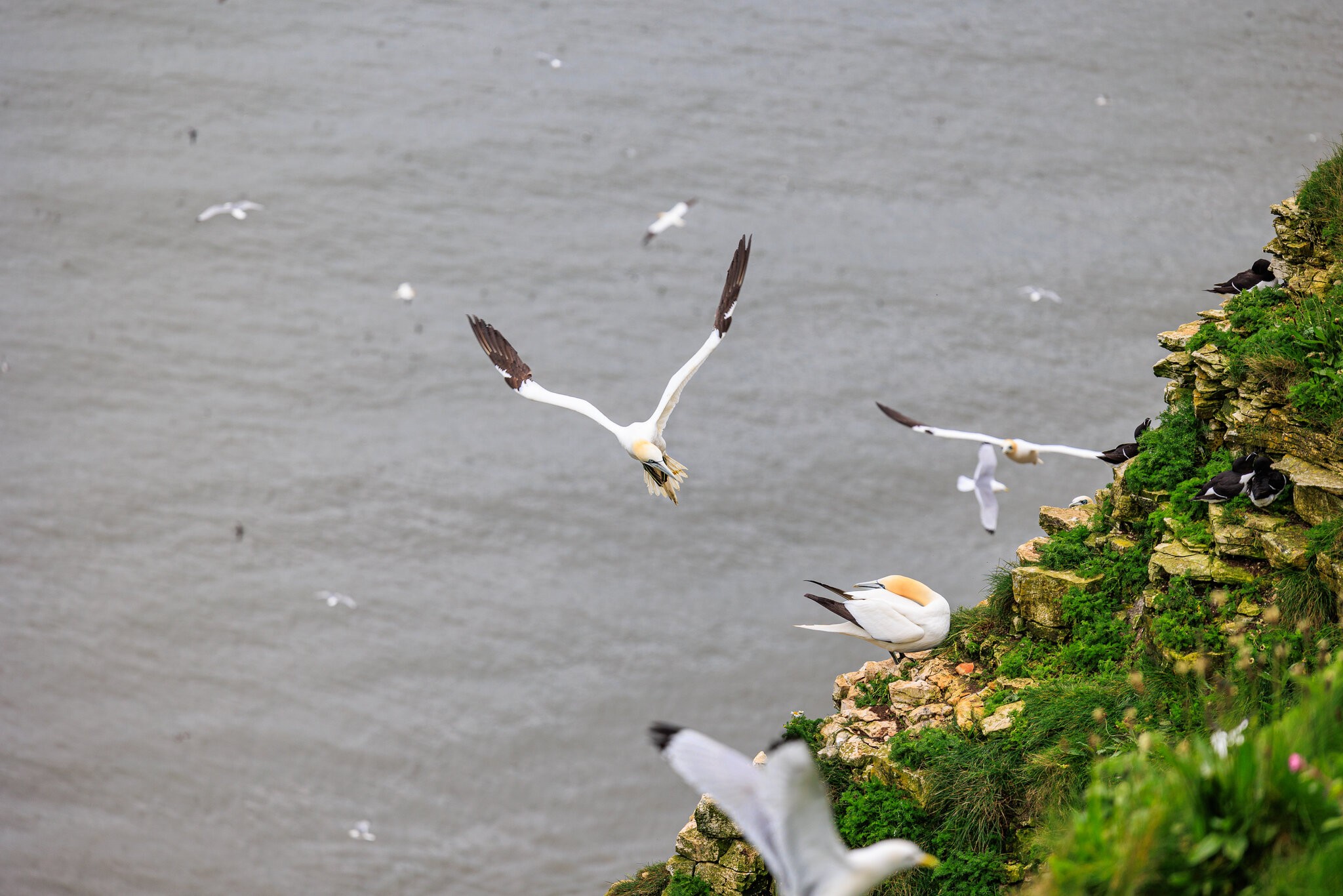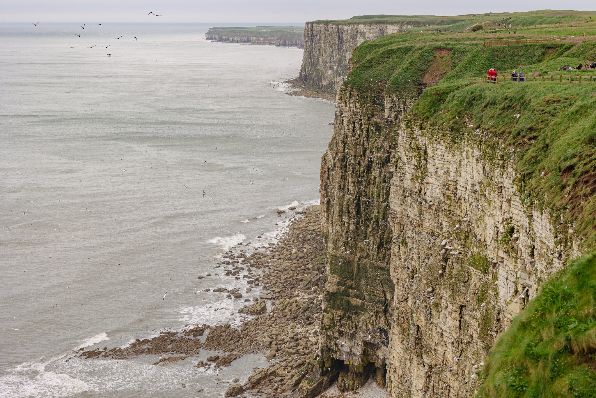 The limestone cliffs are home to a huge number of seabirds, including the largest gannet colony on mainland Britain. It was grey and rainy. Yorkshire weather.