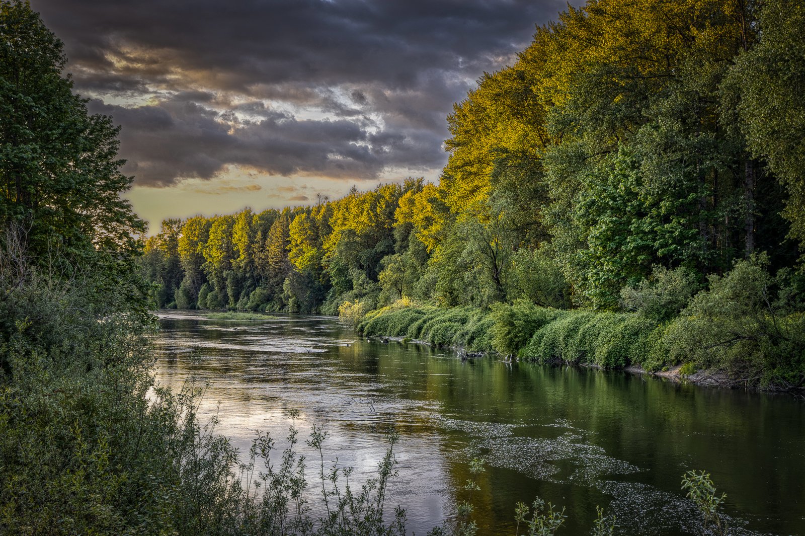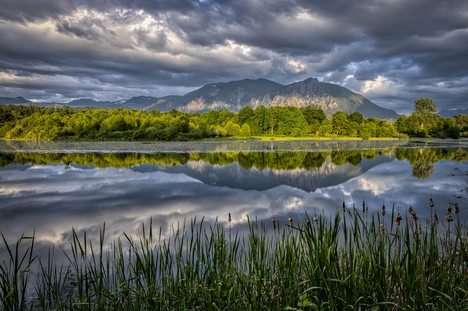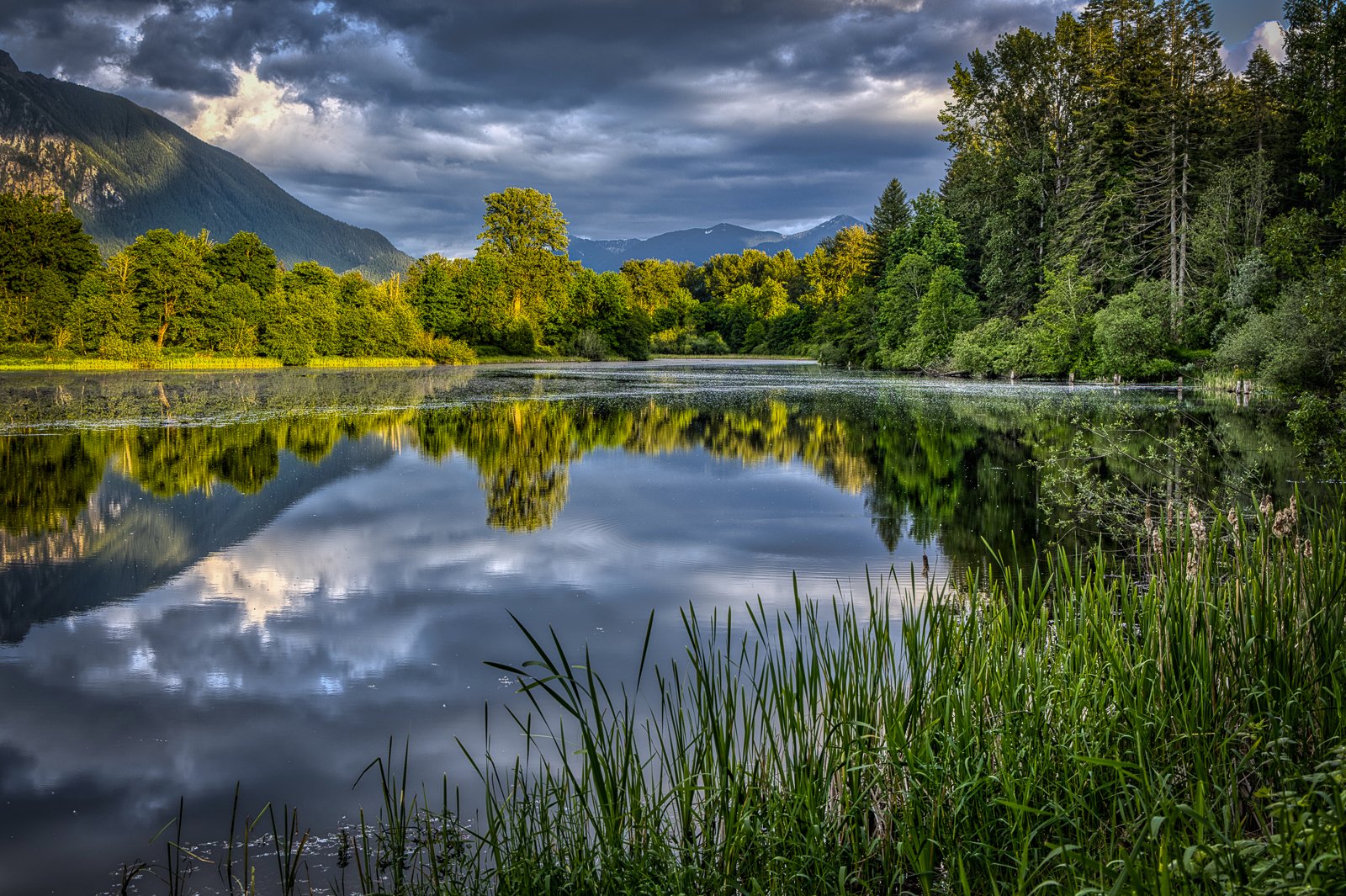 I can see Mt Si from my house and I keep an eye on the light and the clouds. Last night we were between storms, so the rain cleared and the sun started sneaking through the broken clouds. I spent the last hour of daylight visiting a few places that I know take the evening sun well.