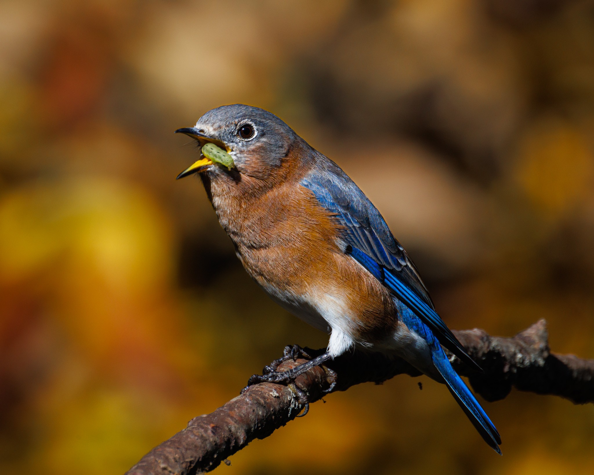Finally, couple of eastern bluebirds in our backyard. The female bluebird has captured a caterpillar and is having a quick snack and the male bluebird posed nicely for me in front of some nice fall color.