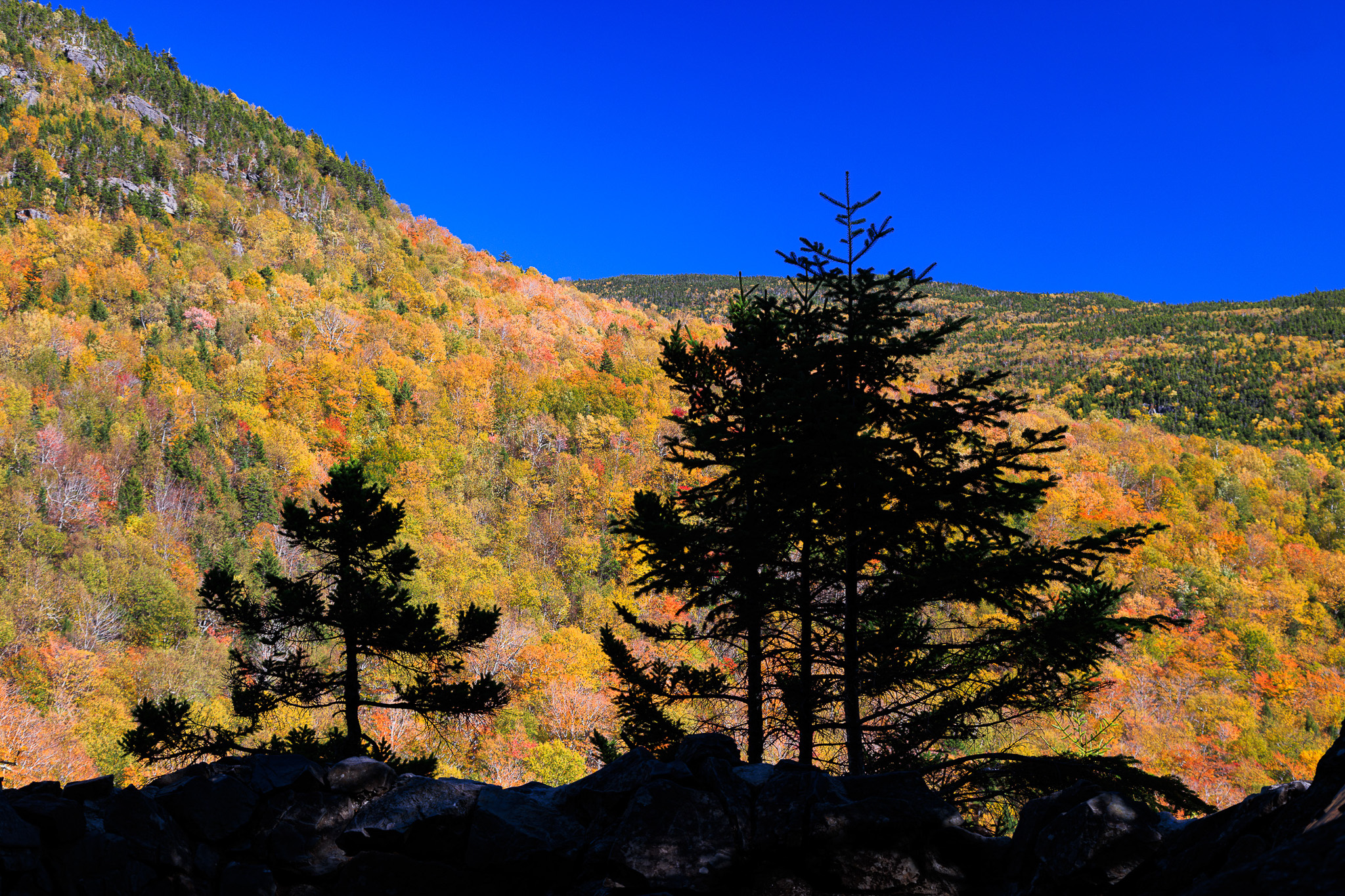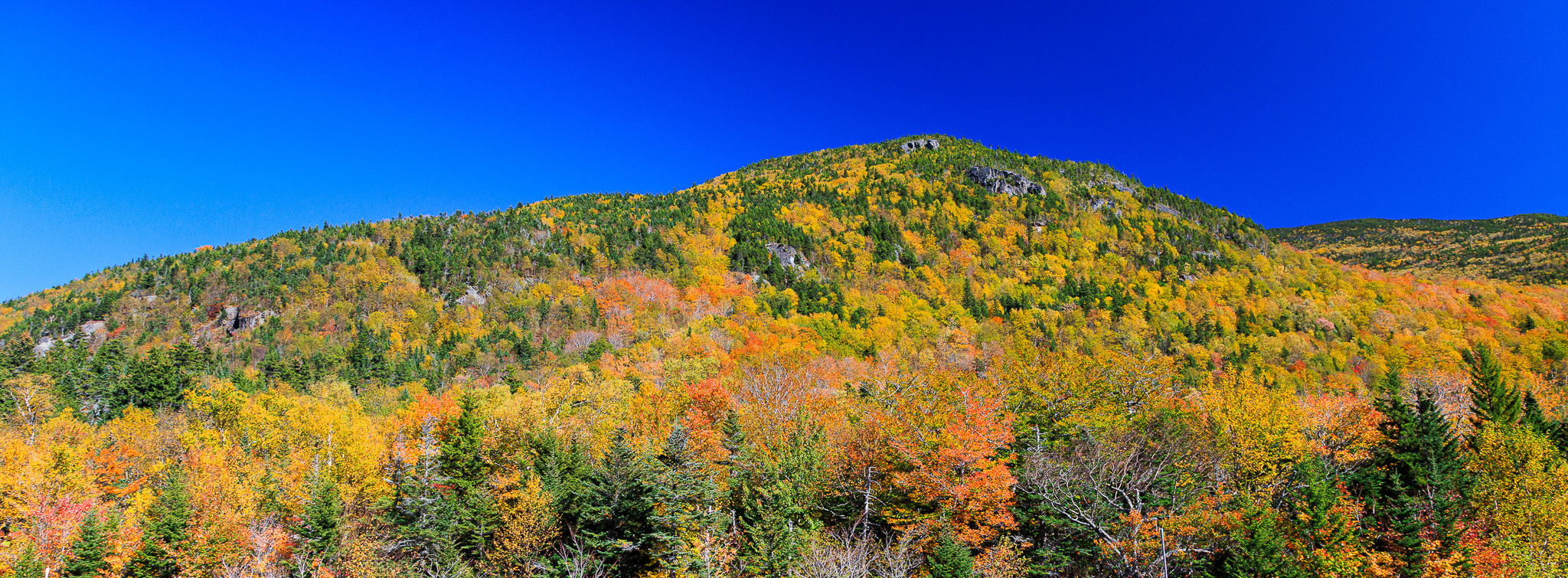 The first day of the first week of our trip we found pockets of color around Mount Washington in New Hampshire, including this ridge of Wildcat Mountain.