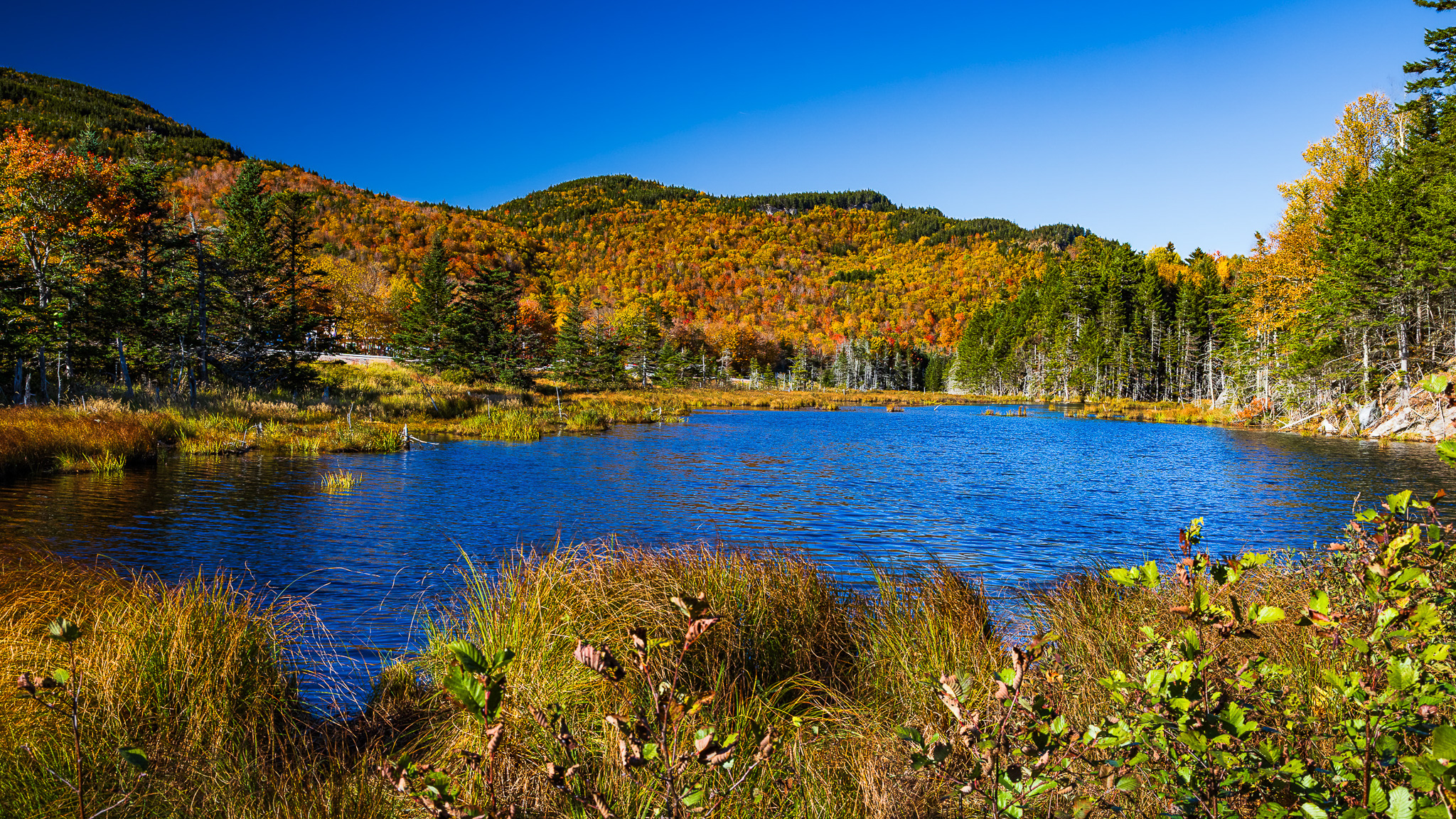 A small pond on Route 16 provided foreground for a colorful ridge that was near peak. But on the ridges on the other side on the pond, there were either orange-brown or yellow-leafed trees.