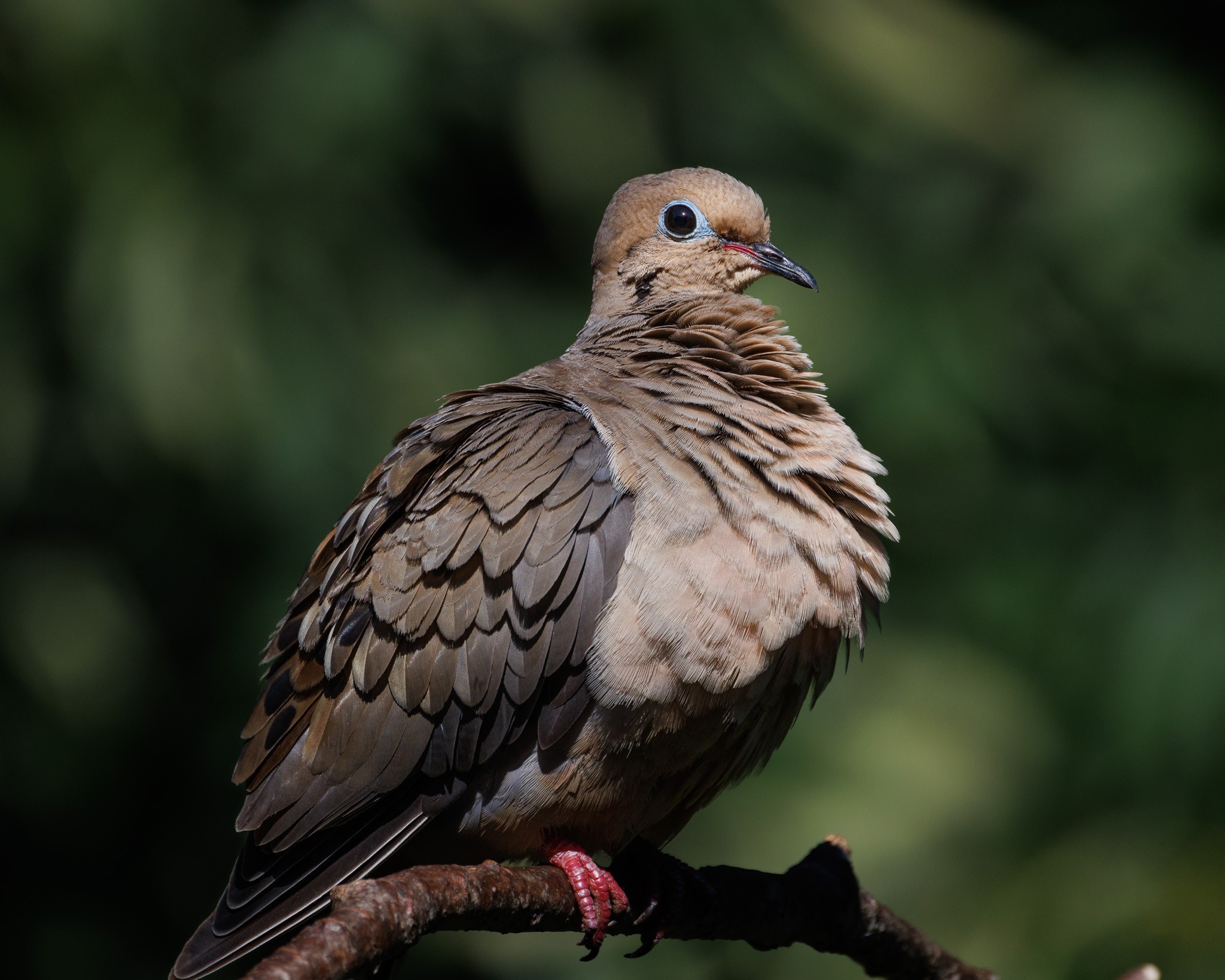 A mourning dove with ruffled feathers; We believe this is an immature bird since it was preening to remove down from various parts.