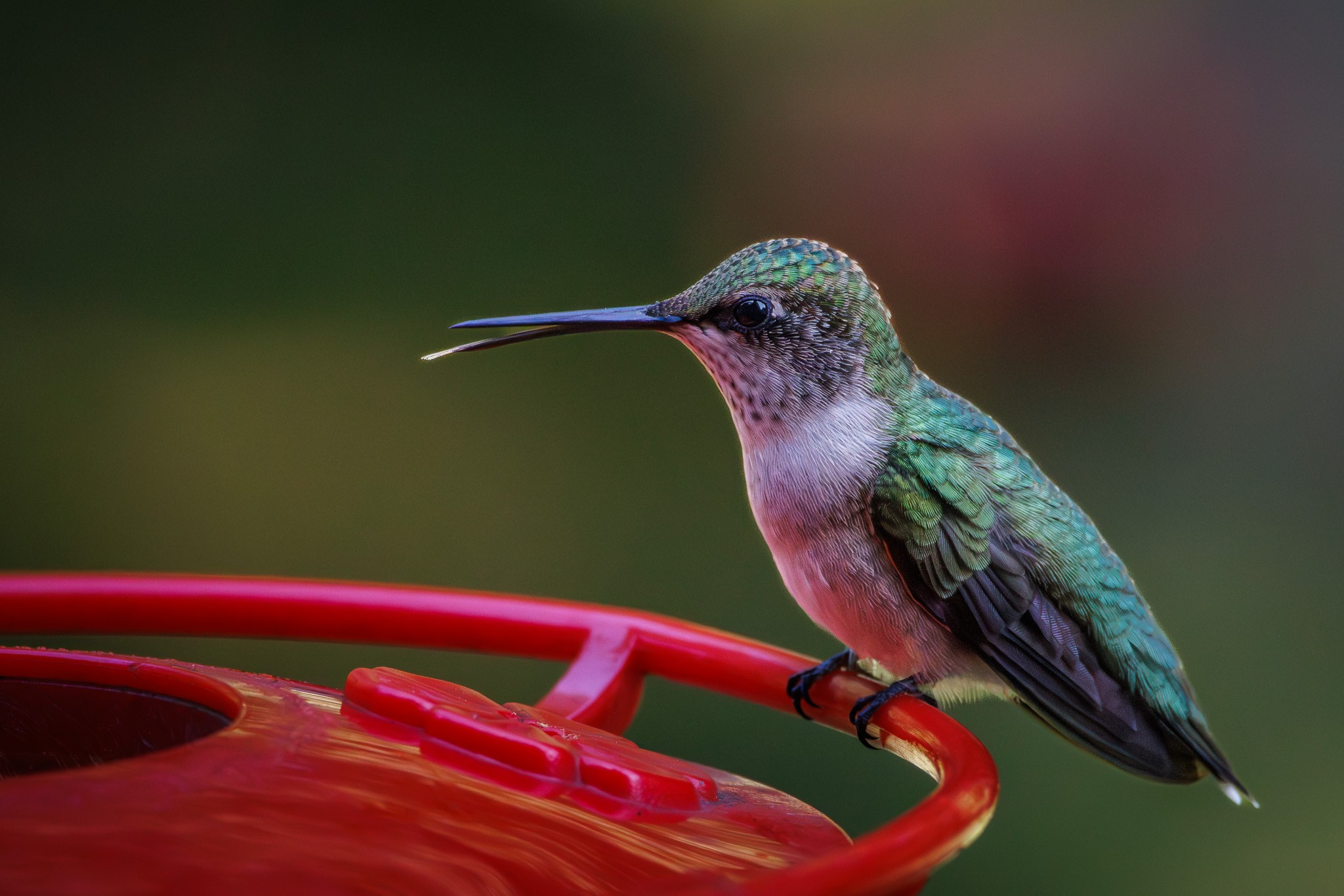 An immature ruby-throated hummingbird sticking its tongue out. We think this is an immature male since it has a little red feather on its chin that can only be seen at certain angles, plus it still seems to be figuring out the whole "feeding on its own" thing